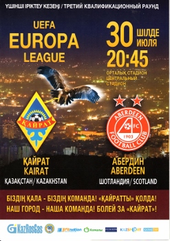 In the 33rd minute Tymoschuk, inspired by Islamkhan's effort had a go from 35 yards but his effort was deflected wide. Ward got up well to claim the corner and take any pressure off The Dons. After 38 minutes McGinn took up another great position on the right of the box, his low cross was partially cleared before the ball rebounded off Pawlett and just wide of the post. The Dons followed that up with another attack as Considine got on the end of a cross from Logan, his defender had the sting taken out of it by a deflection and was easy for the keeper to gather. Considine was now getting further forward with Hayes pushing on as The Dons looked for an away goal. Some trickery from the Brazilian playmaker Barboza got the crowd excited again and created an opening for Kairat but he was forced wide enough to see a shot deflected wide. There was still time for Kairat to have one more attack before half-time as Islamkhan played in Despotovic who was foiled by an excellent diving challenge. The openings were there for The Dons and they would have had plenty of encouragement going into the second half, shortly before the half-time whistle Plotnikov fumbled another cross and certainly looked like a weak point that could be exploited.
